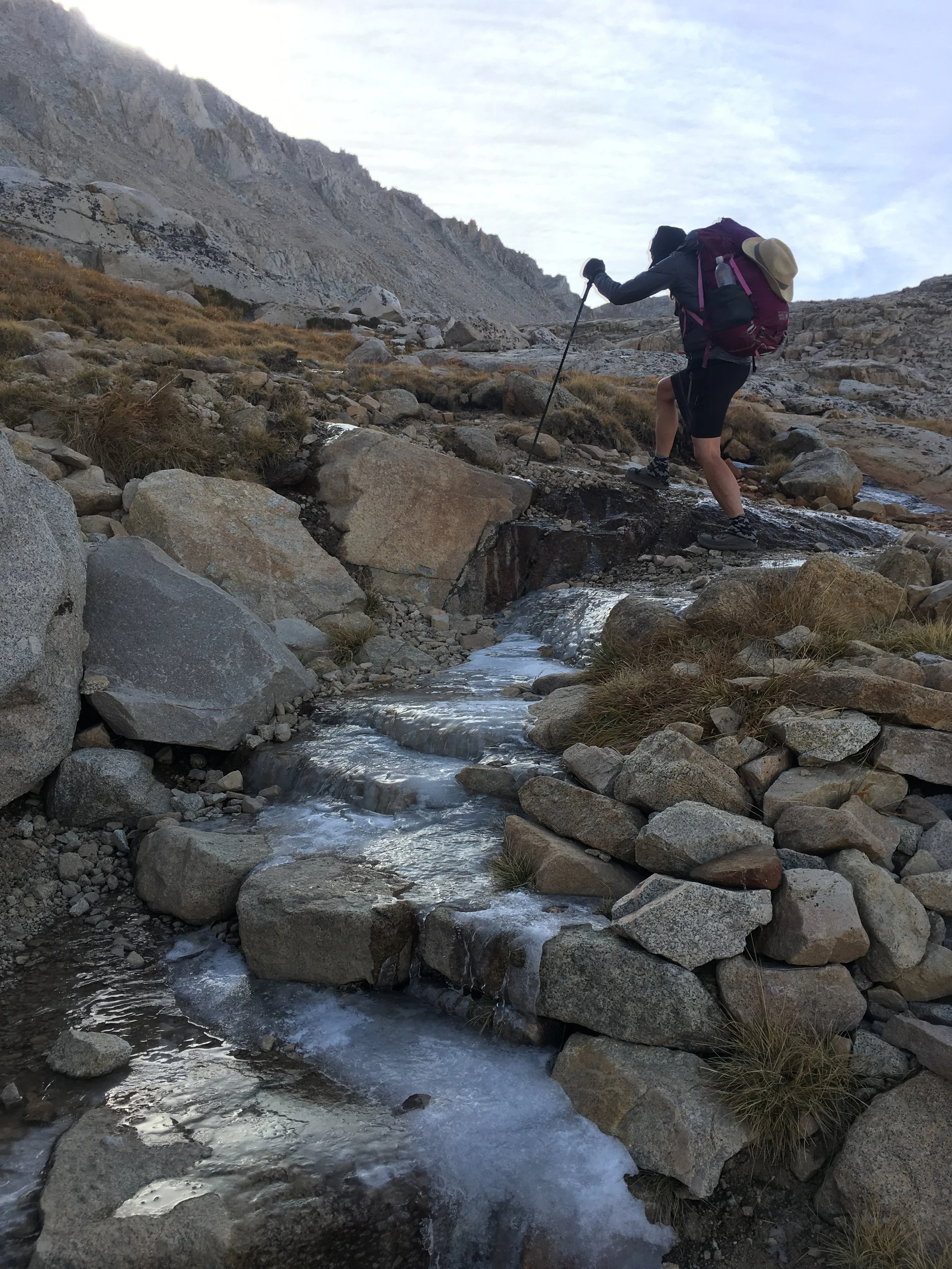 Eventually, we headed back to our little basecamp, and were glad to find that most of the ice had melted from the trail on the way down. We packed up our gear and were headed back towards the PCT when we ran into two more SOBOs, Wrong Turn and Eastwood. We had known from others that they were a day or so behind us, but had not seen Wrong Turn since we camped with him the night before reaching Cascade Locks and had met Eastwood briefly back at Mazama Village (Crater Lake). They asked about camping options and we shared intel on our secluded spot. They were grateful to hear this, as a fellow SOBO recently had gear stolen from the bear locker near the Crabtree ranger station during their Mt. Whitney side trip and they didn't want to leave gear in plain sight. Surprisingly, we did not see Beuna Vista, Sally and Sarah as we headed out. They had planned on camping at Guitar Lake that night for a summit the next day, and we were hoping we'd cross paths on the trail, though perhaps they got a late start. Hopefully, they had a spectacular day atop Mt. Whitney too.