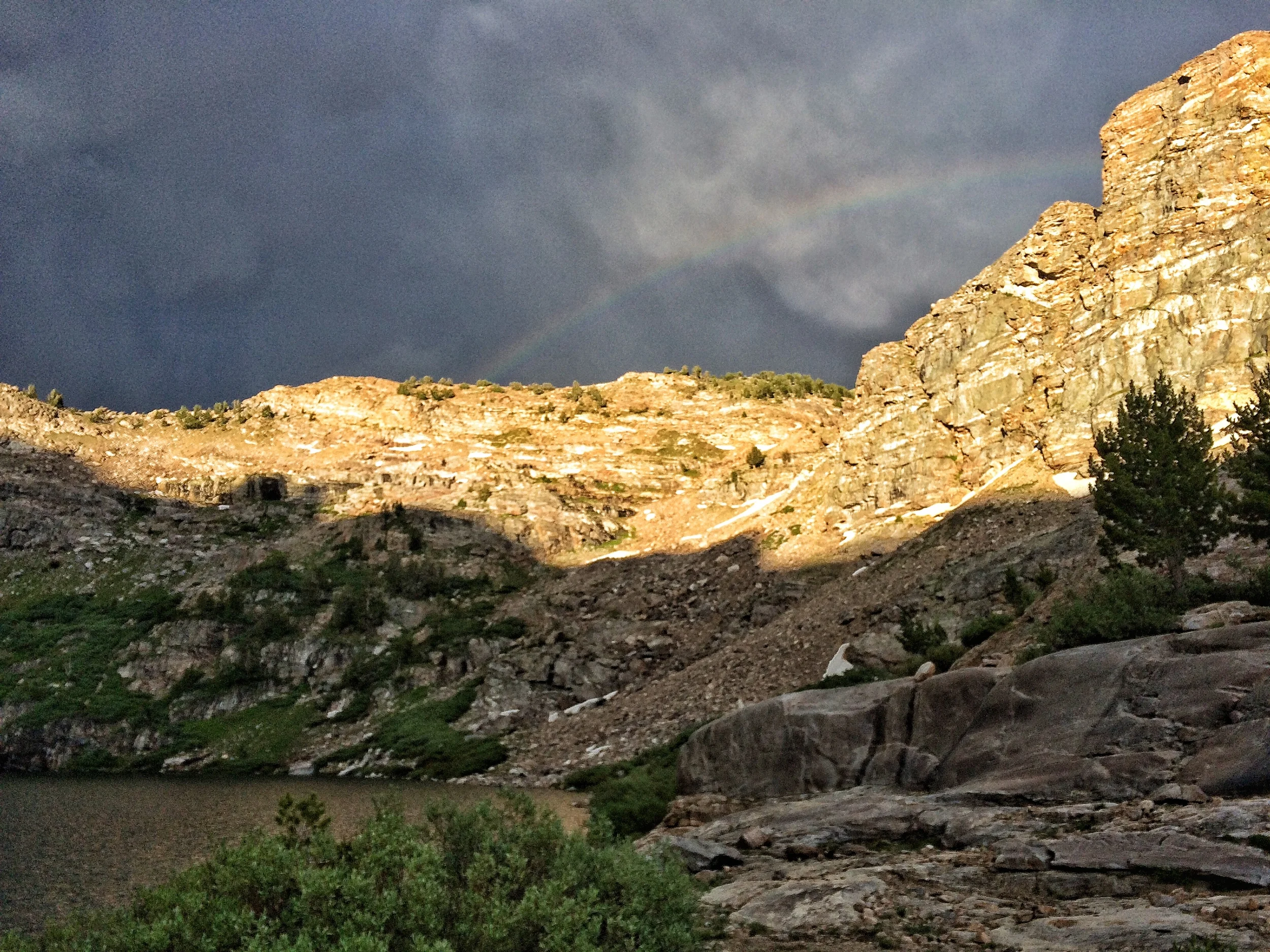 Echo Lake is the largest lake in the Ruby Mountains, and would surely be in stiff competition with Liberty Lake for most famous if it weren't so hard to reach on foot. It sits high in a small cirque surrounded by craggy peaks and overlooking the flat valley to the west. Summer had not quite arrived in the cirque, and we walked past green shoots pushing up through patches of snow as we followed the south shore towards the outlet. For the first time in the Rubies we were swarmed by mosquitos, to the point that we grabbed out our bug netting for protection. A chorus of thunder accompanied our hurried selection of a sweet little spot to pitch a tent from several options on the west shore. No sooner had we thrown on the fly and tightened the lines but it started to sprinkle rain and quickly progressed to an outright downpour. We took shelter from the storm for about an hour and emerged to a prolonged sunset light show rivaling some of our favorite evenings in the Sierras. We wandered around in the post-storm glow after dinner and were treated to a rainbow finale just before dusk. Although we were the only ones at the lake, there was plenty of evidence that others had been there, and none of them were any good at Leave-No-Trace principles. Some litter was overt trash, and much more consisted of rusty, broken, and/or forgotten items that were probably useful to somebody's camp at one time but now were eyesores in this otherwise pristine wilderness site. This was the first instance of such a problem we had seen in the Rubies and it was a big disappointment, for we still had a few days to go and most of the items were large and not easily packed out by us. We didn't let this ruin what was otherwise a magical evening of solitude at a most beautiful spot.