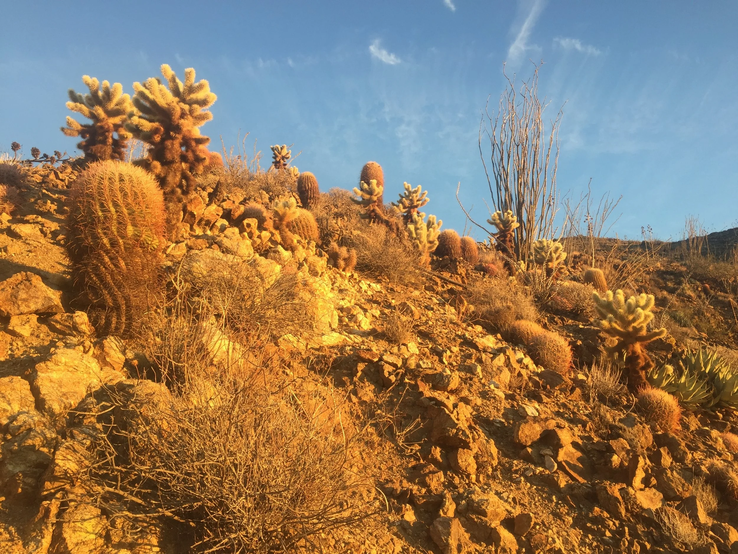 Morning golden hour in the San Felipe Hills, and the only ocotillos of the entire hike