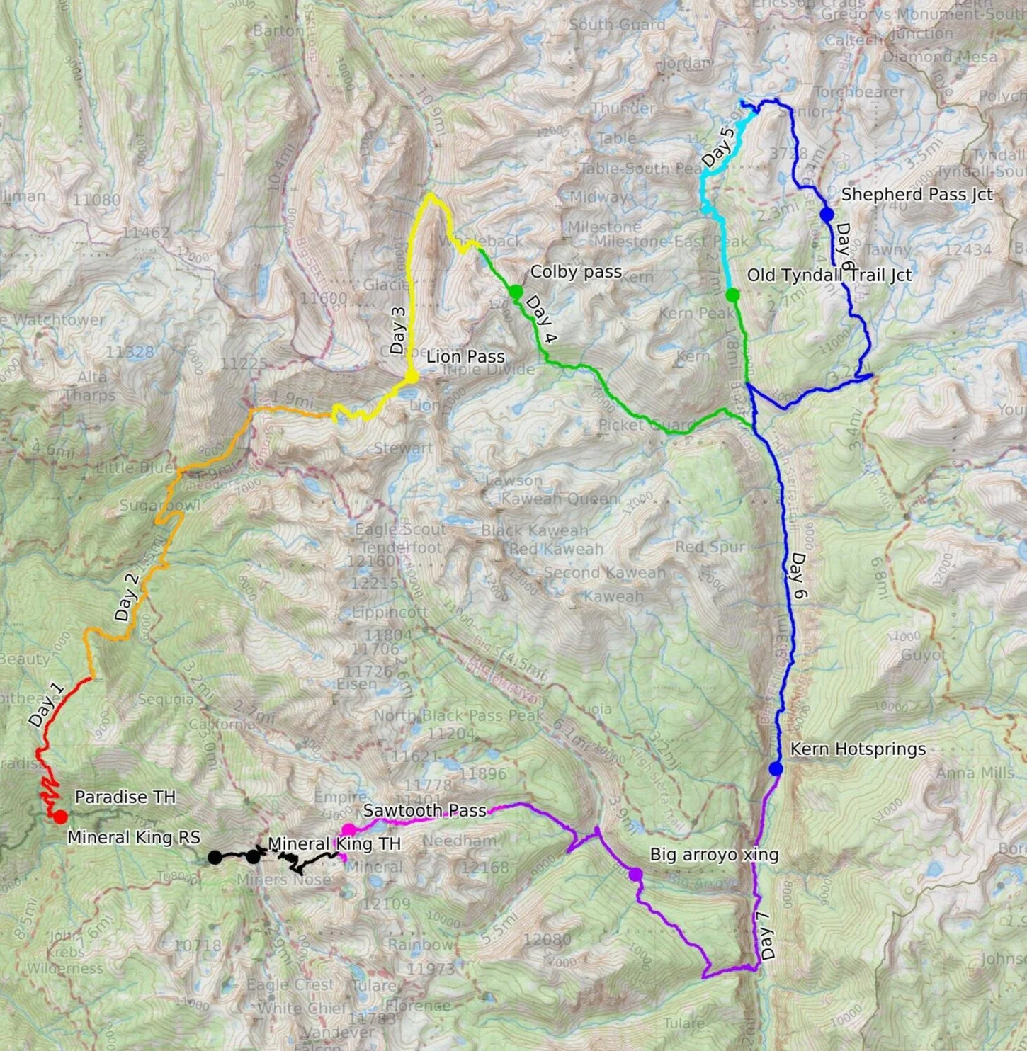 Day 6: Upper Kern Basin to Kern Hot Springs, via JMT/PCT then HST